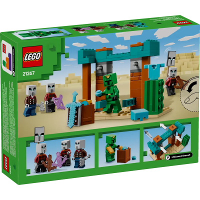 Set in a Minecraft desert outpost, kids role-play being a Cactus Knight, with its diamond armor and shield and sword. When 3 illager figures arrive to steal treasure, kids must defend the outpost. The set includes missiles that kids can launch with a flick of their finger, a variety of weapons and a barrel that holds the treasure.