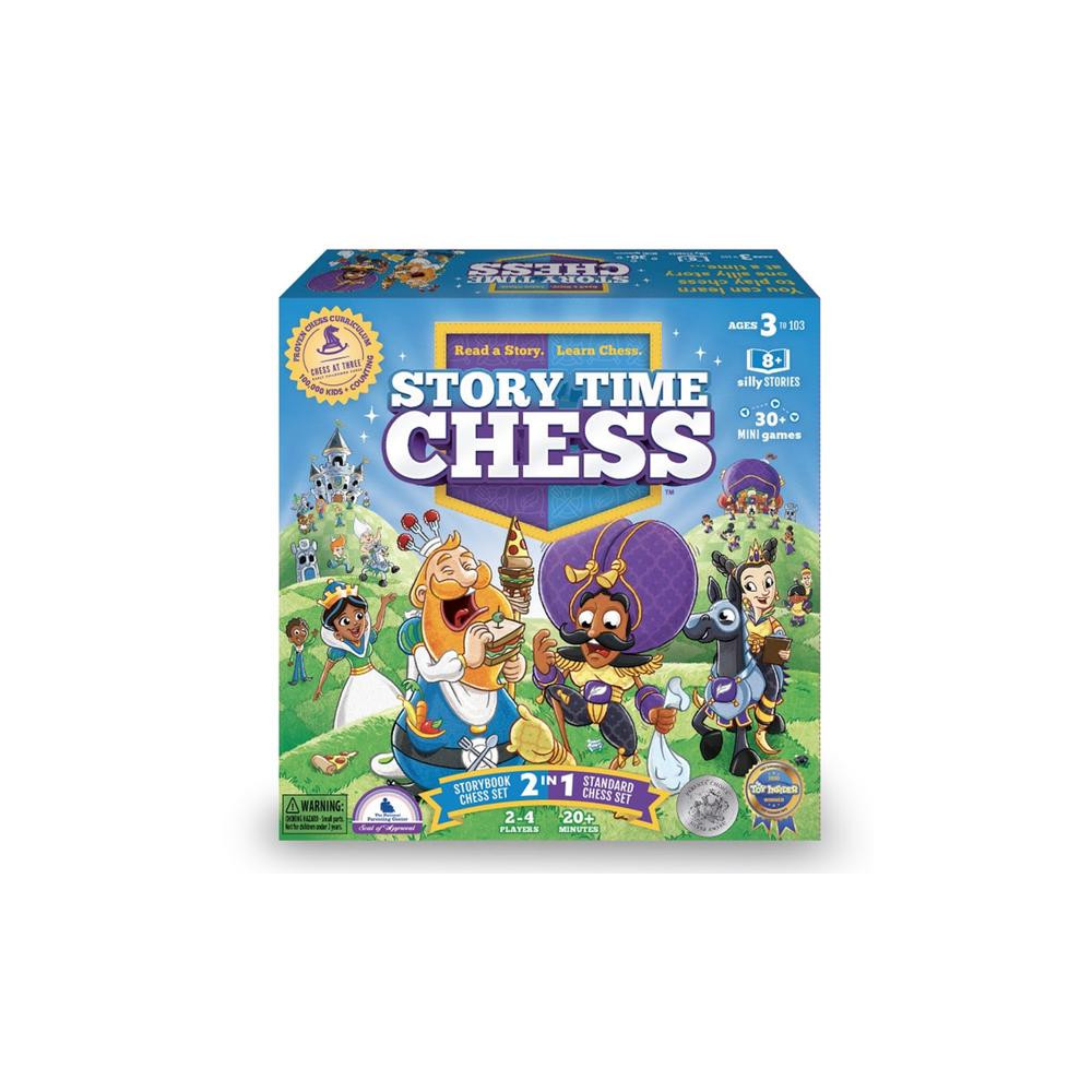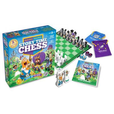 Story Time Chess is a board game that teaches chess to young children using silly stories, vibrant illustrations, custom chess pieces, and a unique chess board. The stories and supporting materials communicate the rules of chess to children ages 3 and up in a way that makes learning chess simple and fun. Best of all, no chess experience is required for parents or children to learn.
