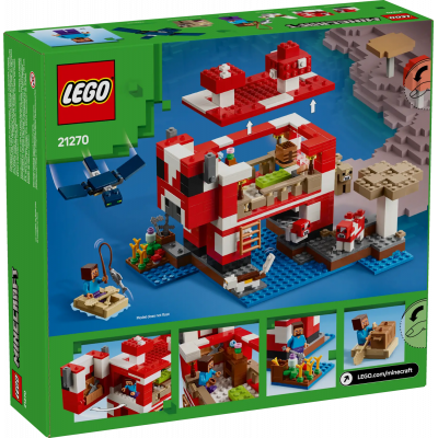 Set in the mushroom island, this LEGO Minecraft house-building toy includes popular character Steve as well as a red mooshroom, baby red mooshroom, brown mooshroom, calico cat and the hostile flying phantom. The playset is packed with elements that feature in the game, including a small farm area with wheat, mushrooms and a pitcher plant growing alongside a composter. Accessories include a fishing rod, cod, hoe, netherite sword, bowl, boat with oars, chest, furnace, crafting table, bookshelf, bread and a bed.
