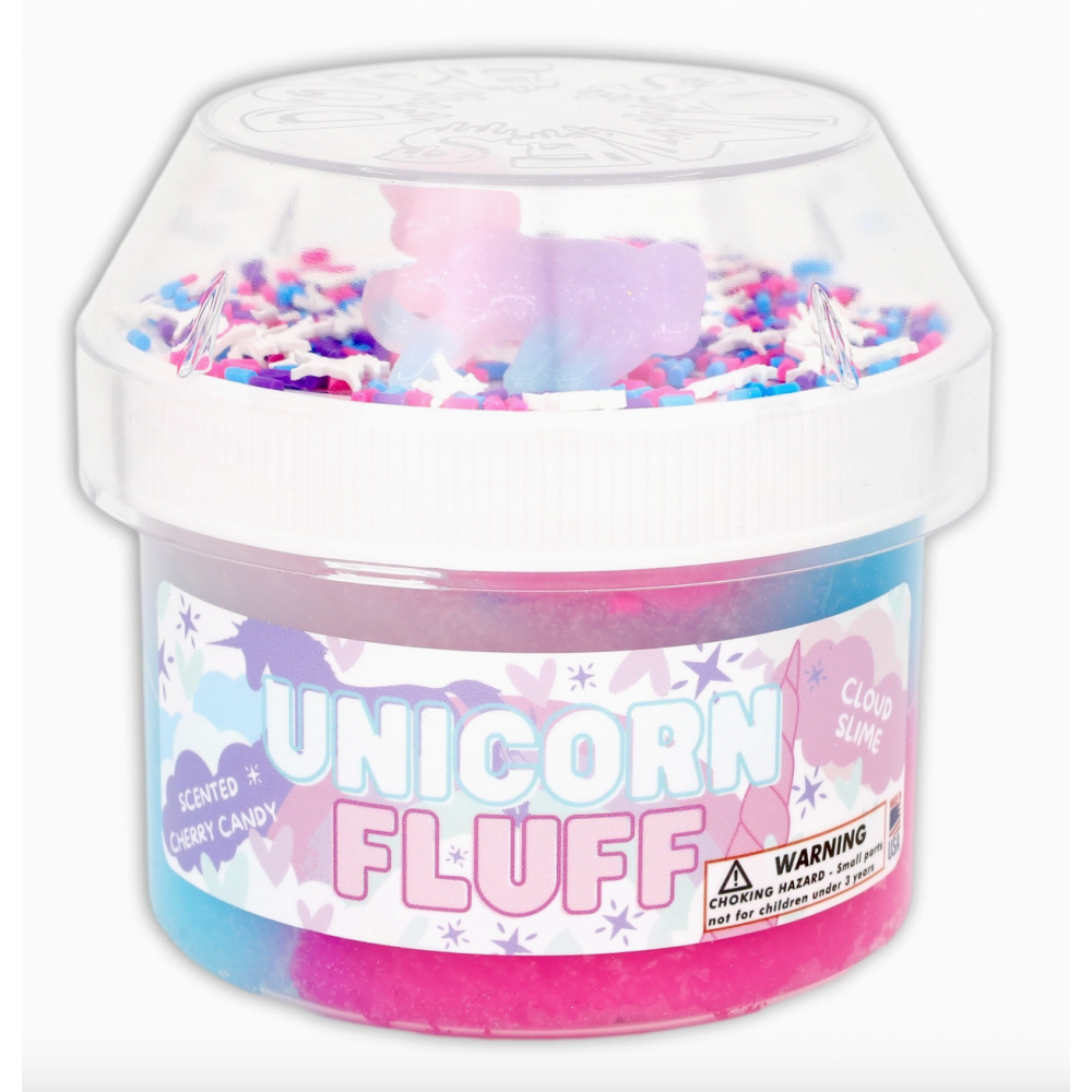 Unicorn Fluff is a tri-colored fluffy icee slime! The pink, blue & white colors are such a stunning combo and satisfying to mix together! Mixes to create a pastel purple cloudy yet ultra smooth icee texture! Topped with sprinkles, & scented like sweet cherry candy.