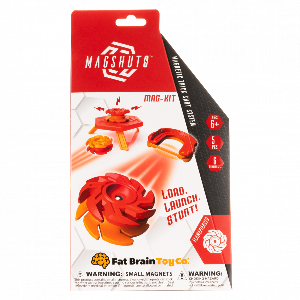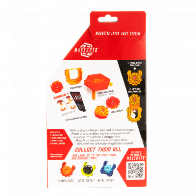 Mad, rad, magnetic action! Load one of the Mag-Pods into the shooter, pull it back with just your finger, aim, and launch. From there, endless trick-shot possibilities explode into action. Take on the challenge cards. Invent your own insane stunts. Slide, flip, and fly into gravity-defying action. But, it's not a trick until you hear it click! Magshuto. Become a trick shot master!