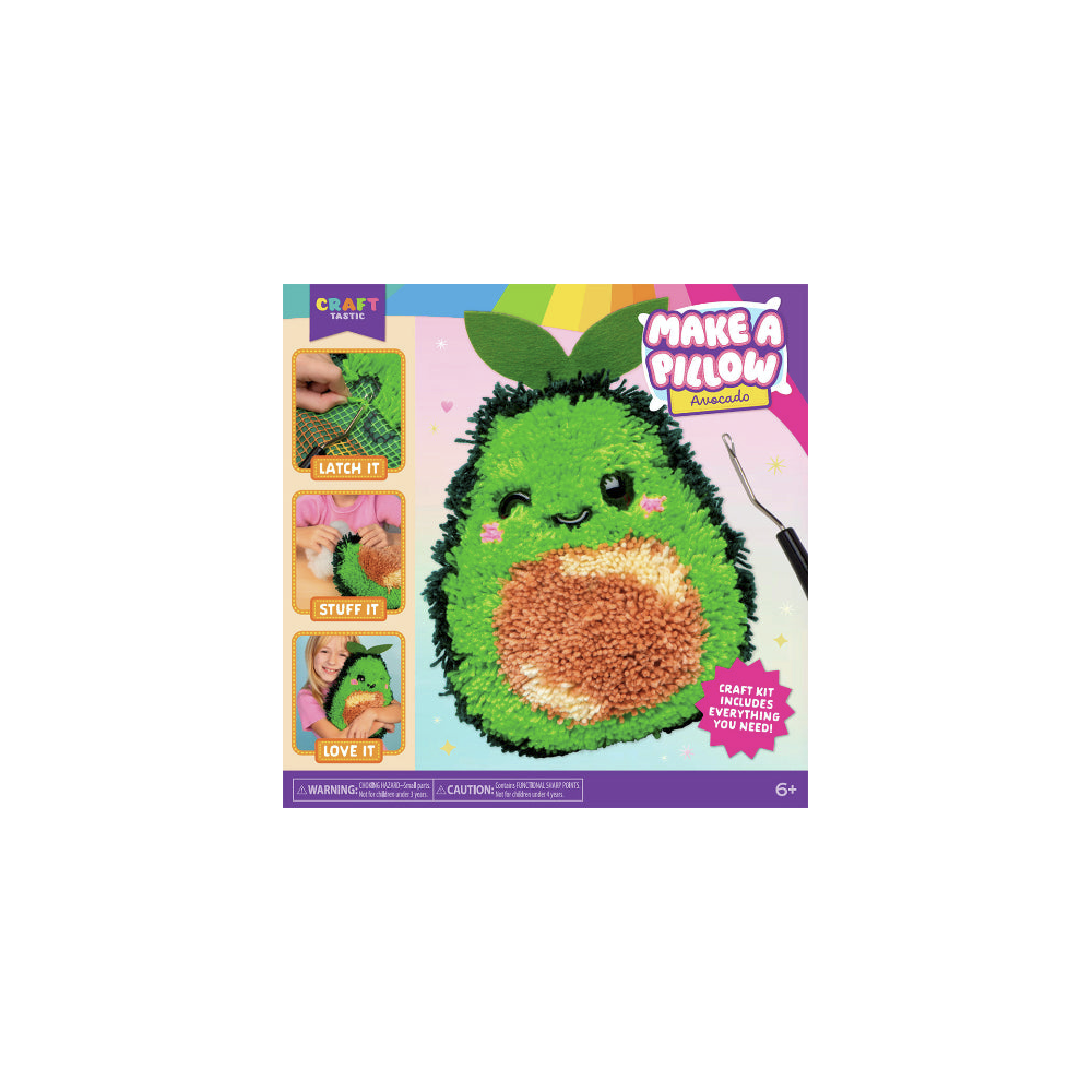 Make your own cuddly companion! Following the printed colors, just latch, hook, and pull to cover the mesh surface with bright, fluffy yarn. Then, stuff it with the included stuffing, zip it shut, and finish it off with the friendly eyes, smiling mouth, and felt leaves. That's it - You're ready to snuggle! Embark on a highly nutritious crafting adventure with the Make-a-Pillow Avocado.