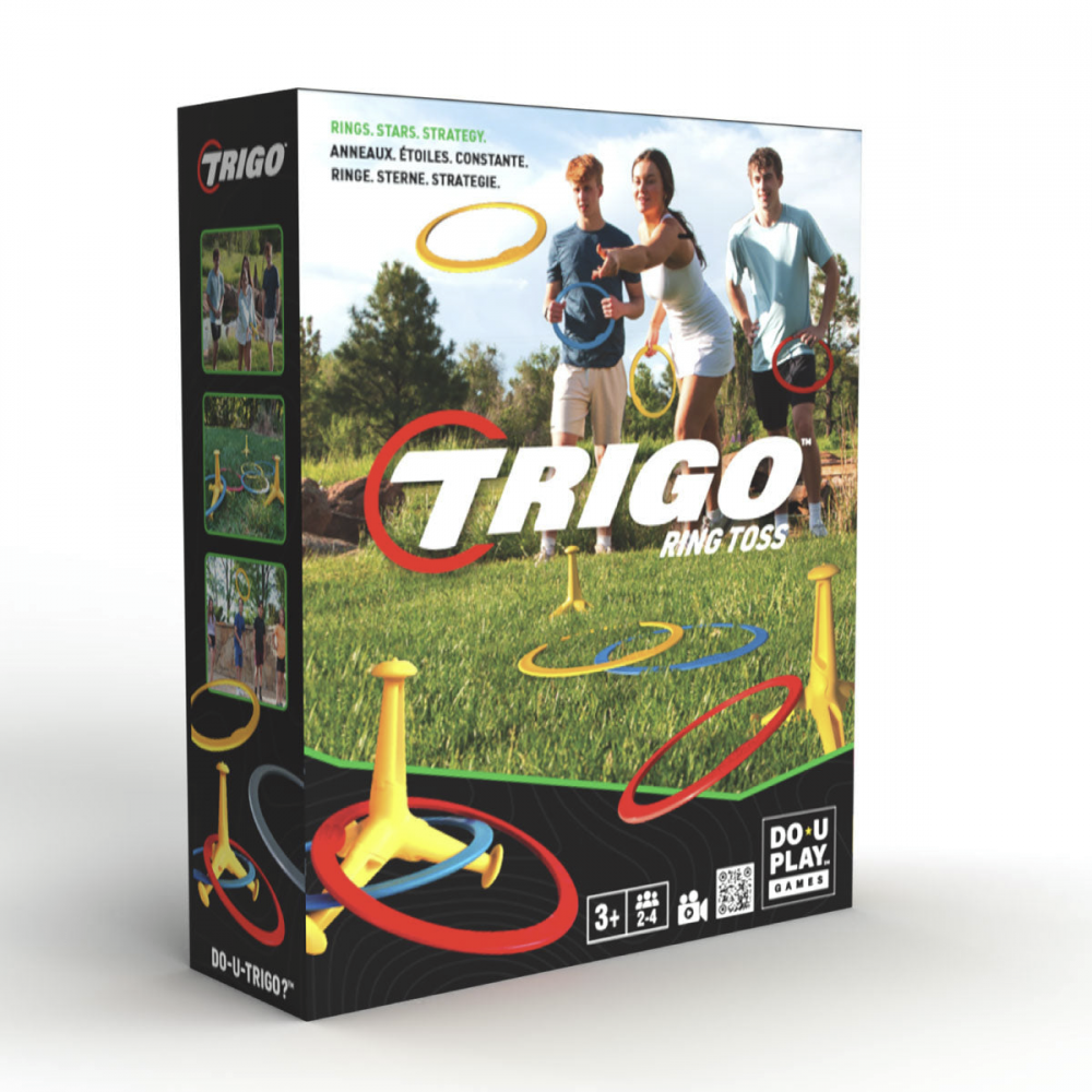Trigo is played by 2 to 4 players with the 3 Trigo Stars laid out in a triangle shape, approximately 10 yards (3M) away from the throw line. Players take turns throwing the rings. The OBJECT is to throw your rings into the middle triangular space created by the Trigo Stars and score points. The additional strategy is to score points by redefining the "triangle shape" after you ring the actual star.