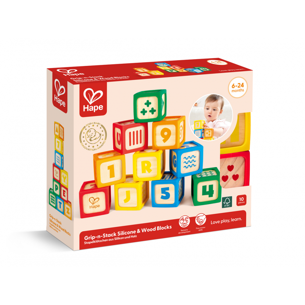 The Hape Grip 'n' Stack Silicone and Wooden Blocks come in bright colors and feature the alphabet, numbers, and patterns, adding an educational element to playtime. The removable silicone sides are perfect for easy cleaning, ensuring hygienic fun for your baby. Not just blocks, but tools for early learning! These blocks encourage the development of fine motor skills, grasping abilities, and hand-eye coordination with these fantastic building blocks.