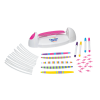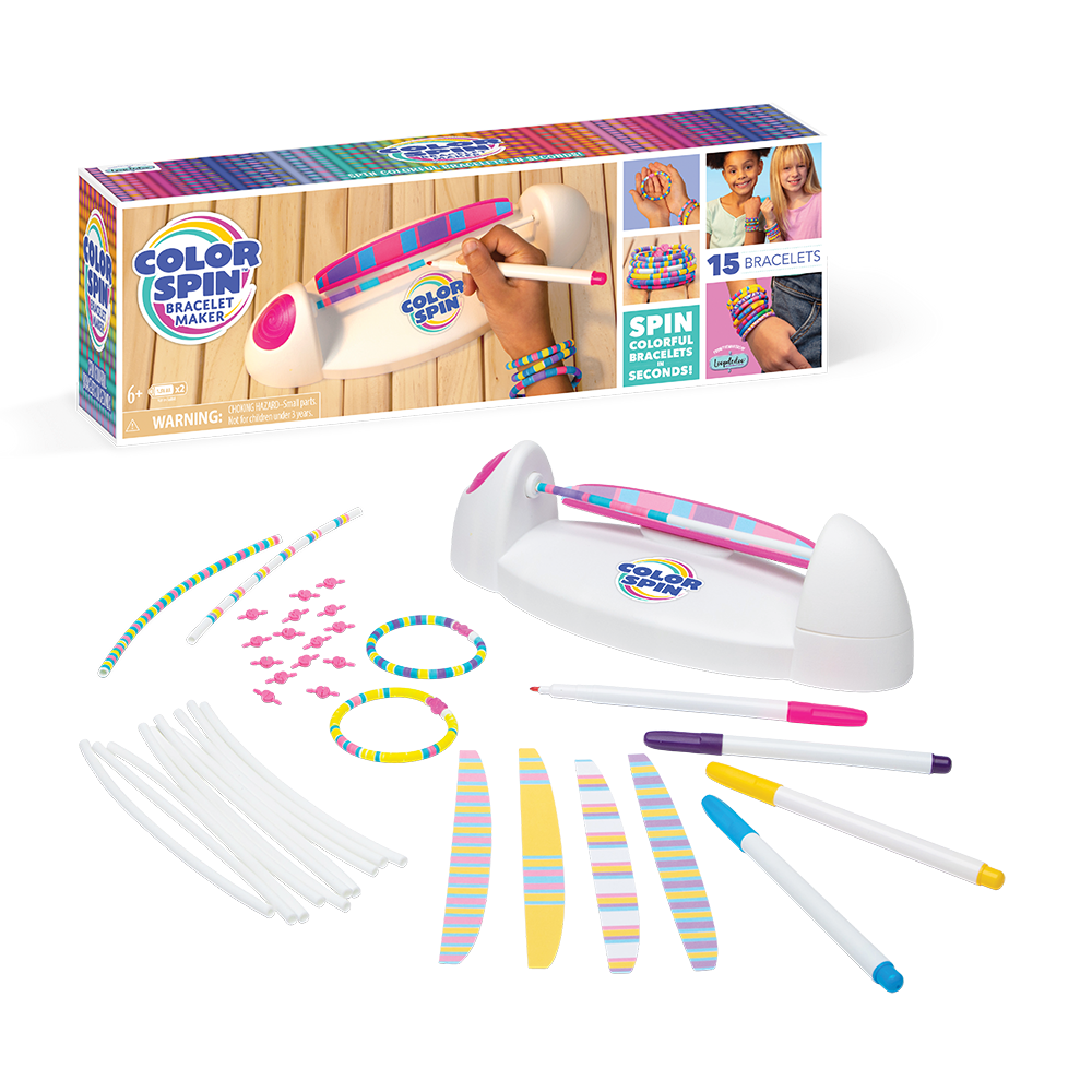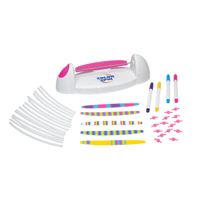 Make amazing bracelets in a way you’ve never seen before with ColorSpin, from the makers of Loopdedoo! Choose a template or your own imagination, set up the machine, and press the button to start the spinning. Then all you have to do is touch a marker to the bracelet to add your color! No more easy-to-lose beads or difficult stringing—Just push, color, and you’re done! ColorSpin Bracelet Maker comes with the incredible ColorSpin machine, 15 bracelet tubes, 15 heart-shaped clasps, 4 colorful permanent markers, 5 double-sided templates, and easy-to-follow instructions.