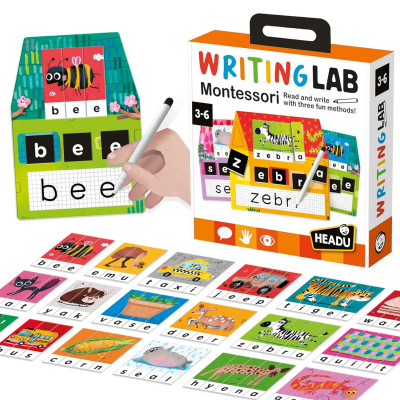 Headu Writing Lab Montessori kit contains- 72 letters, 3 words-houses, 18 puzzle, 3 little boards, 1 erasable pen, and a didactic guide. Can be paired with prek workbooks age 4-5, writing supplies for kids, learning books for 3-4 year olds, and a kindergarten handwriting workbook.