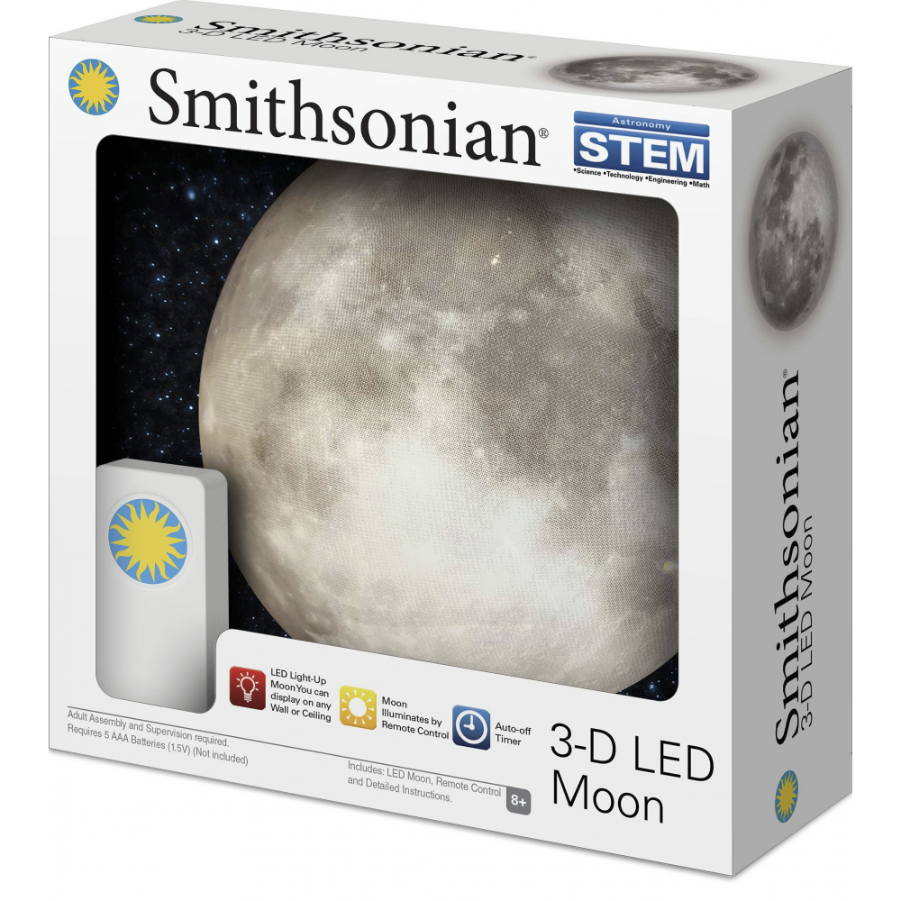 This Smithsonian Glowing 3-D Moon Kit lets you turn your child's room into a planetarium and provides a fun way to teach them about Earth's moon. Charges with any light. Glows in full spectrum color. Kit includes: moon with 1 hook, clear string for hanging and detailed instructions.